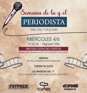 El miércoles 4 a las 19.30 se realizará una proyección de cortometrajes a cargo de estudiantes de Comunicación de la Universidad Nacional de Río Cuarto. Los mismos son: «Heridas», «Cuidar de ellos», «La tragedia del 77». Se proyectarán en la sede del Cispren Río Cuarto.