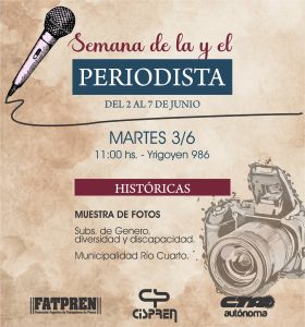 Las seccionales del Cispren de Río Cuarto y Villa María traen una nutrida grilla de actividades para conmemorar y celebrar el Día de las y los Trabajadores de Prensa. Se proponen debates, presentación de libros, muestras fotográficas, proyección de audiovisuales.