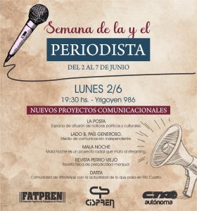 En Río Cuarto, el cronograma da inicio con una diversidad de actividades que se inician el lunes 2 de Junio desde las 19.30, en la sede de Yrigoyen 986, con una charla sobre nuevos proyectos comunicacionales: «La posta», «Lado B, País generoso», «Mala junta», «Revista perro viejo», y «Datita».