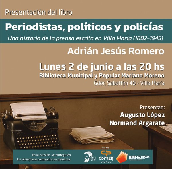 El lunes 2 a las 20 , en la Biblioteca Municipal y Popular Mariano Moreno (Gob. Sabattini 40) se realizará la presentación del libro » Periodistas, políticos y policías. Una historia de la prensa escrita en Villa María (1882- 1945)», de Adrián Jesús Romero, periodista, docente e investigador.